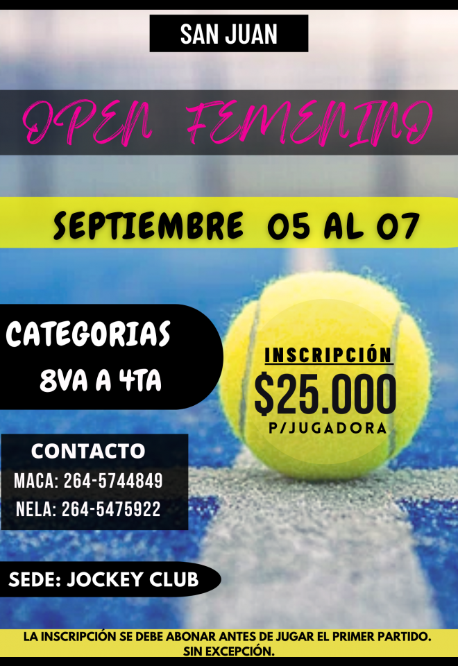 »» Evento: OPEN FEMENINO / . »» Localidad: San Juan »» Fechas: 05/09/2025 al 07/09/2025